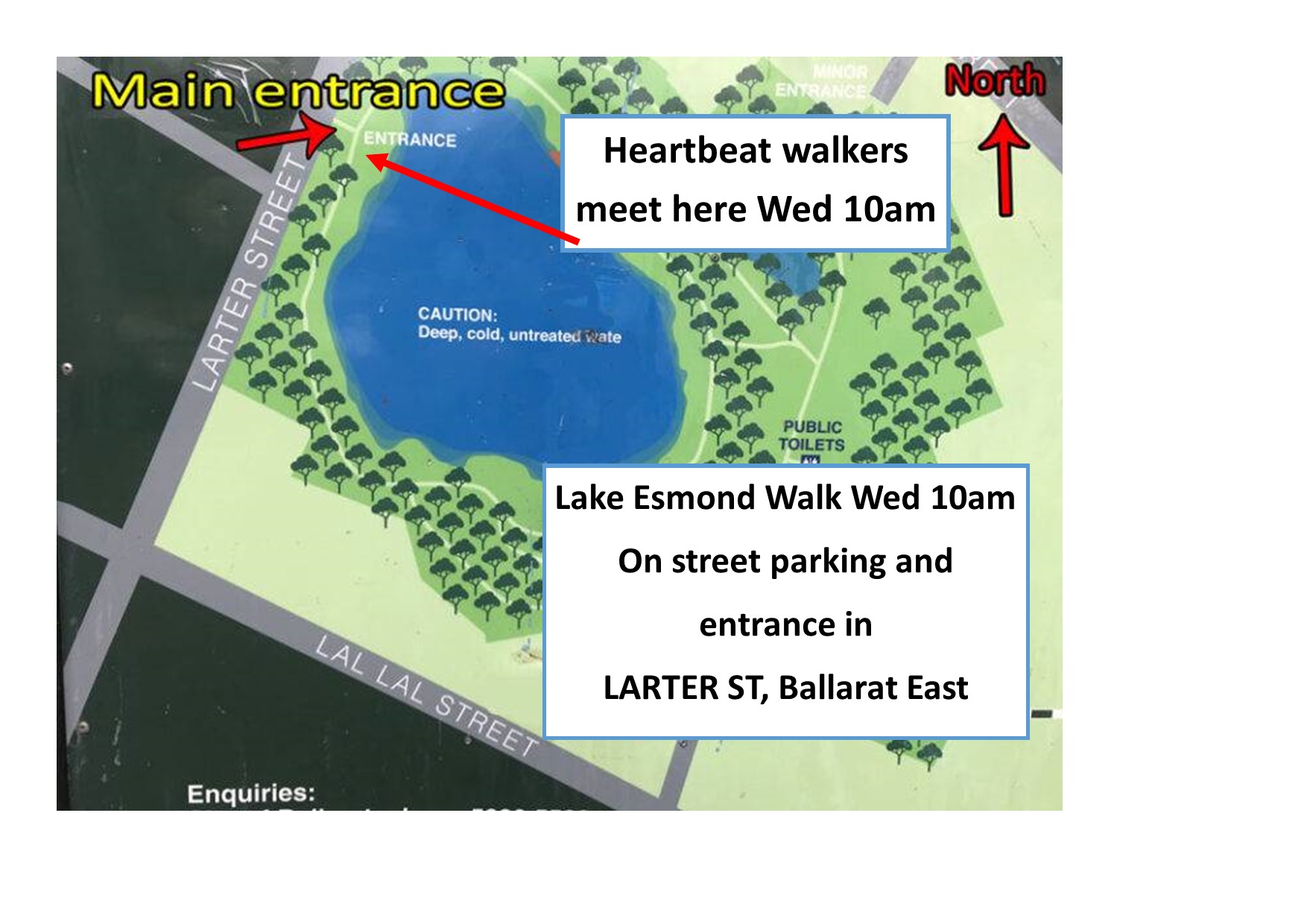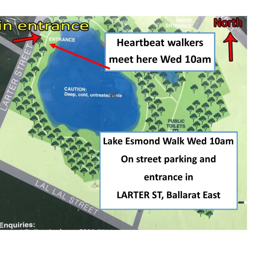 Meet at main entrance in Larter Street Ballarat East Peaceful FREE walk in Lake Esmond Botanic Gardens, own pace and distance, seats avail.