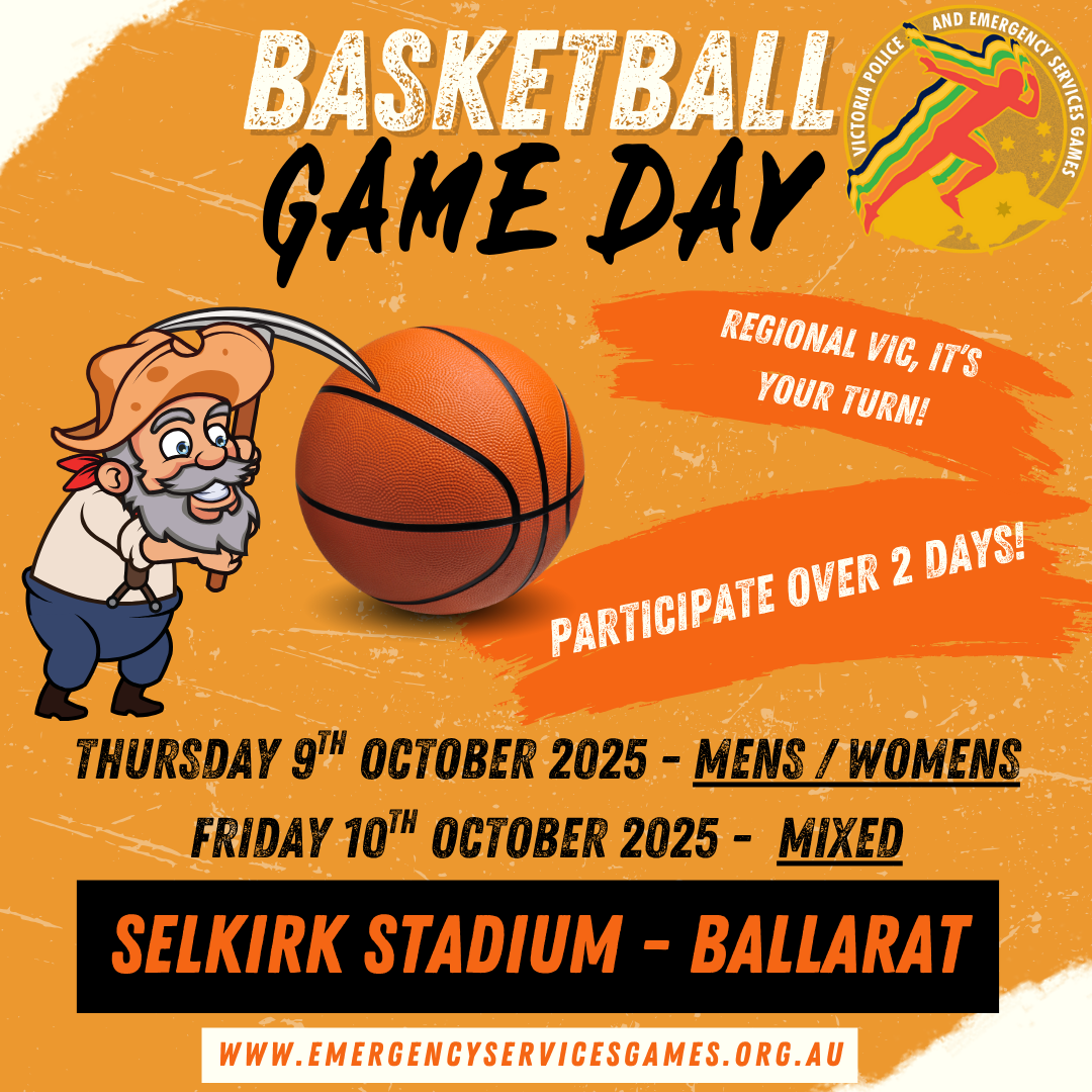 This year, the Basketball Tournament will be located at Selkirk Stadium Ballarat, over 2 HUGE days! – Thursday 9th October 2025 – Men’s & Women’s Teams – Friday 10th October 2025 – Mixed Teams Competitors will compete in round robin style tournament with finals to determine medals.