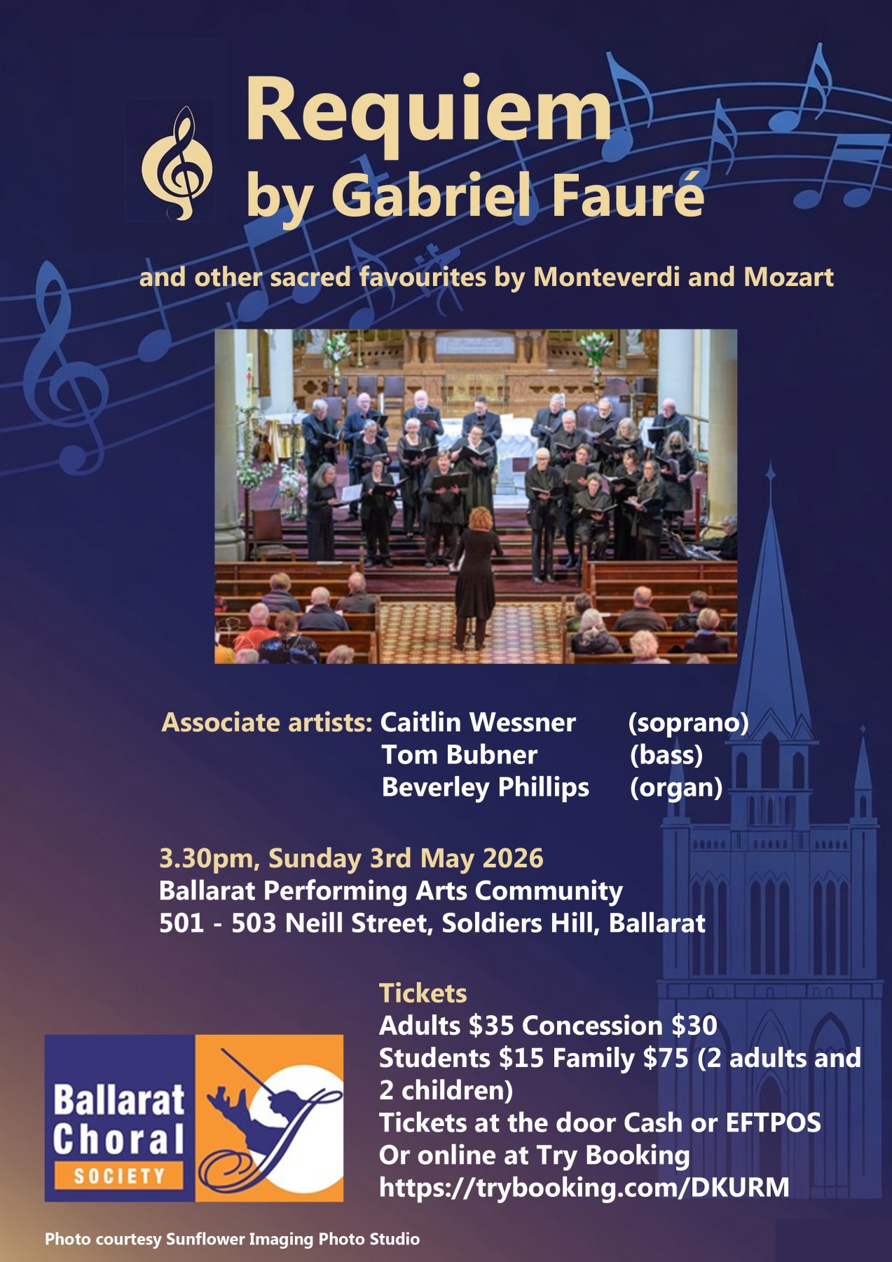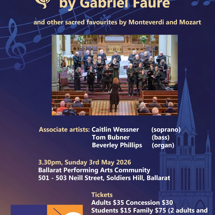 Ballarat Choral Society and Associate Artists perform Requiem by Gabriel Faure and other Sacred favourites by Monteverdi and Mozart at the beautiful chapel of Ballarat Performing Arts Community, 501-503 Neill St Soldiers Hill. Sunday May 3rd 2026 3.30 pm.