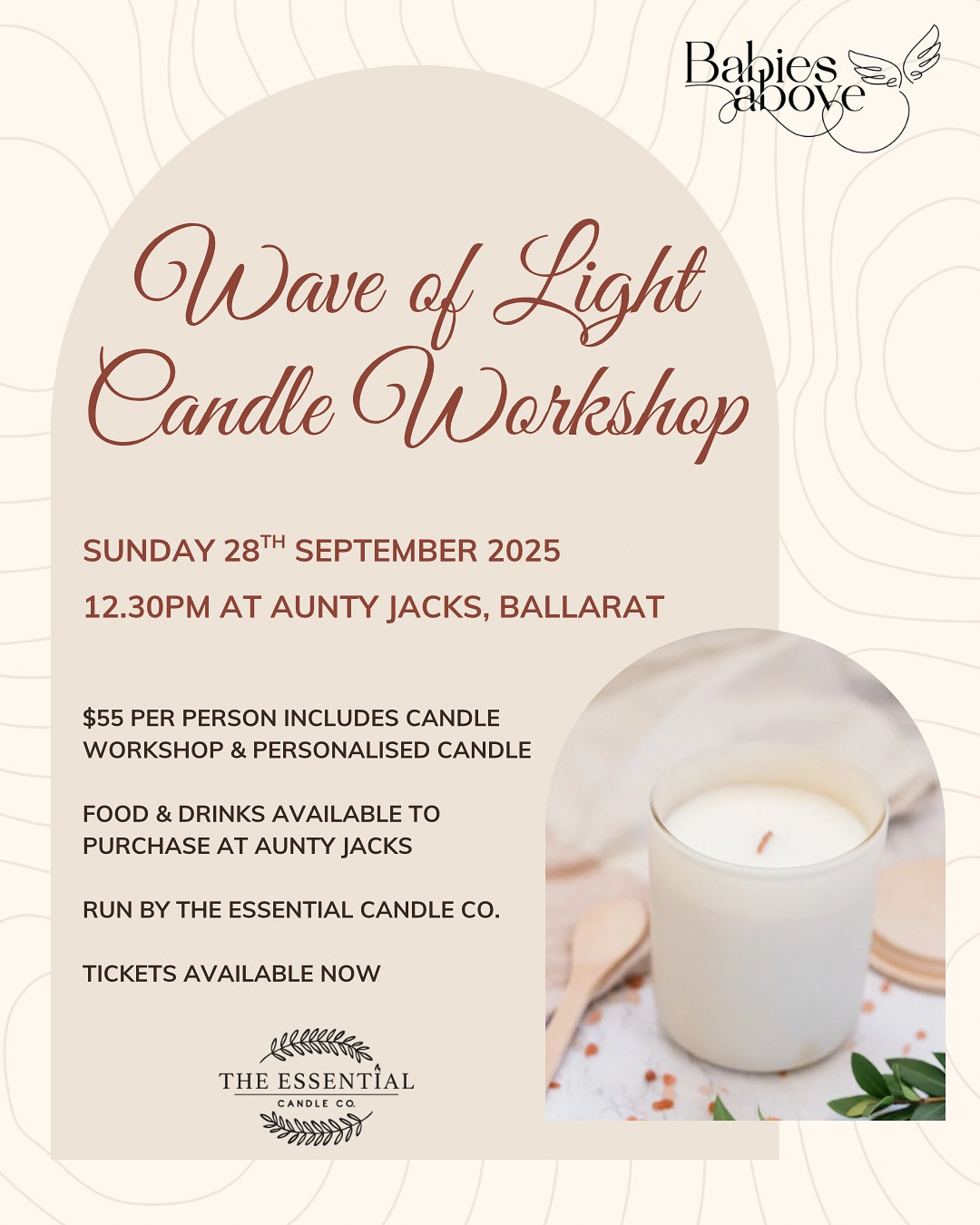 Babies Above are hosting a candle workshop run by the Essential Candle Co. held at Aunty Jacks which you can use for the Wave of Light this year.