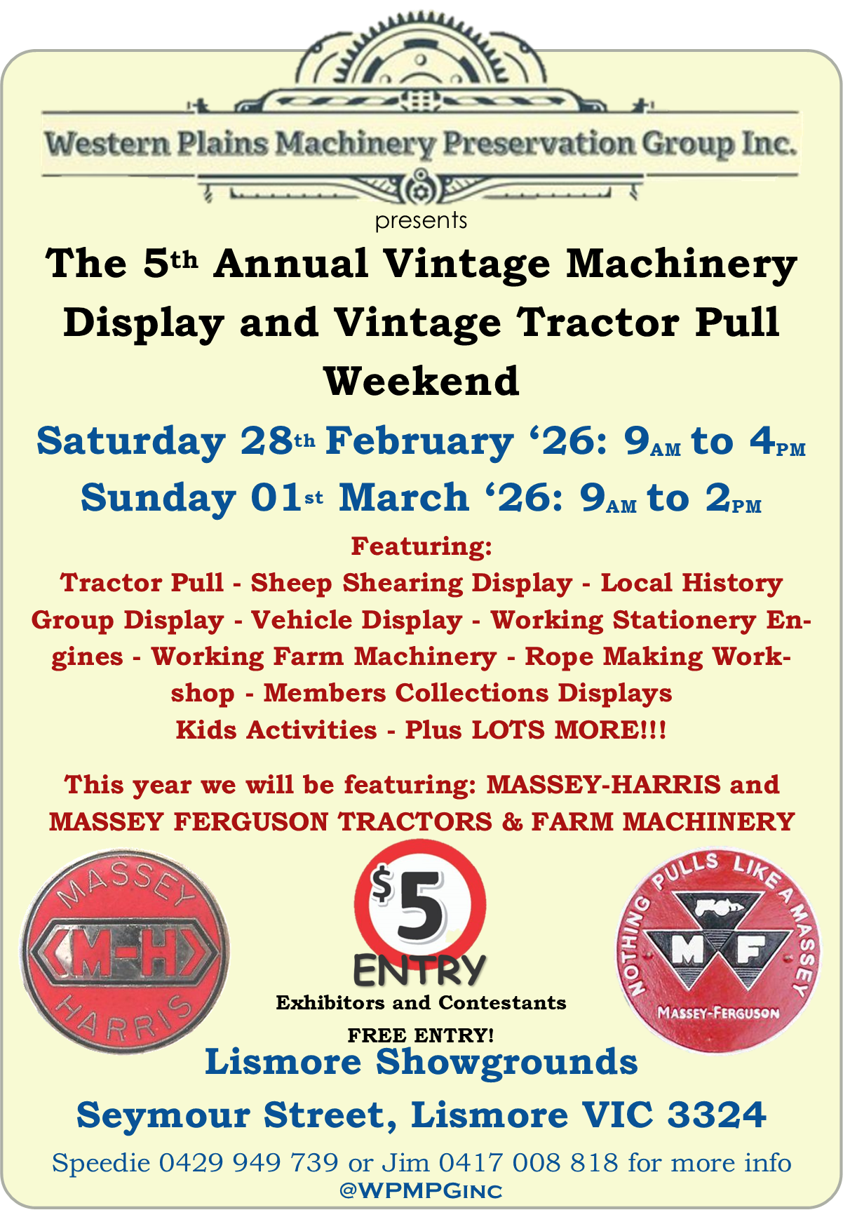 Western Plain Machinery Preservation Group Inc is hosting our 5th annual Vintage Machinery Display and Vintage Tractor Pull weekend.